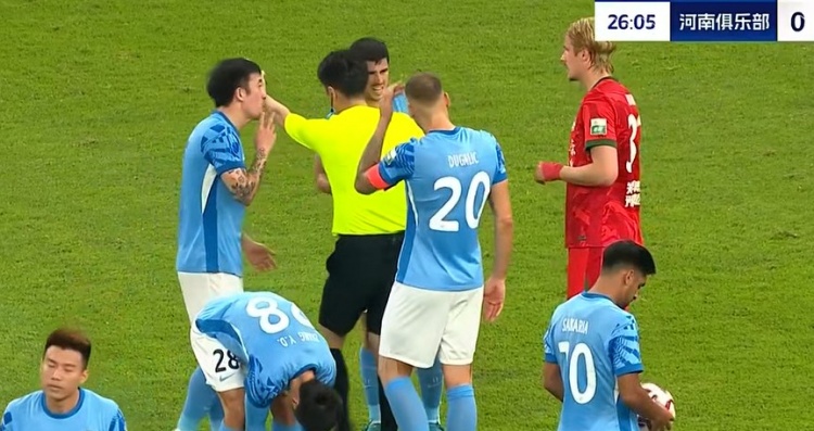 第25分钟,有黄牌在身的叶力江撞翻对手,深圳众将围住裁判施压,但主裁没给第二张黄牌。↓