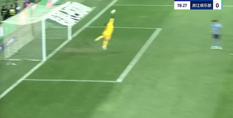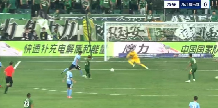 第65分钟,韩佳奇大脚开出,张玉宁头球摆渡,法比奥跟进形成绝佳的单刀机会,赵博出击勉强碰到法比奥的单刀射门,皮球减速后缓缓滚向球门,刘浩帆赶在皮球过线之前极限解围↓