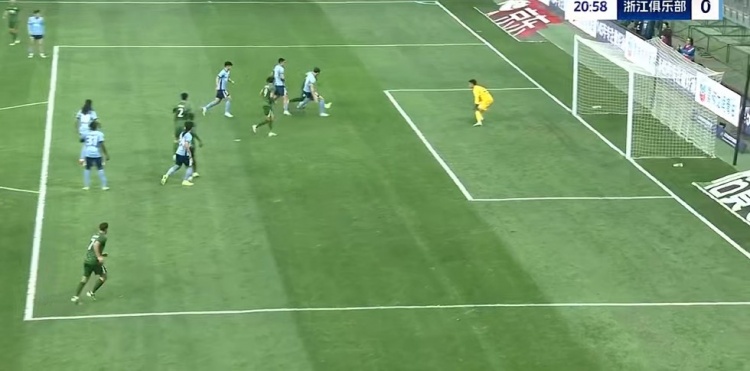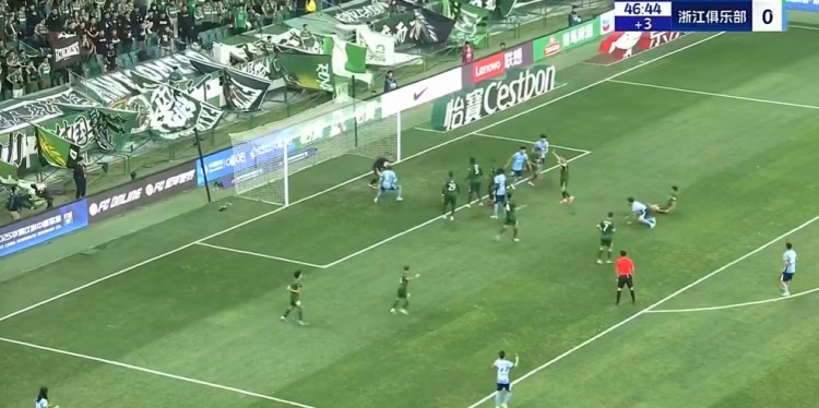 第45+2分钟,浙江队大禁区左侧定位球机会,李提香主罚开到后点,卢卡斯高高跃起顶出弹地球没有力量,门将轻松没收↓
