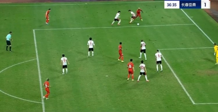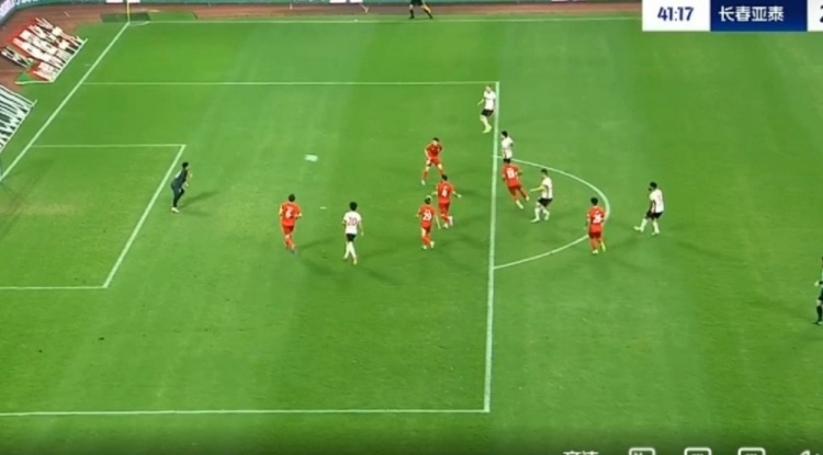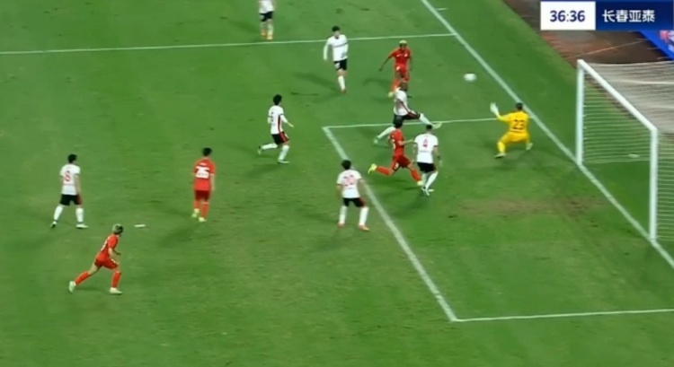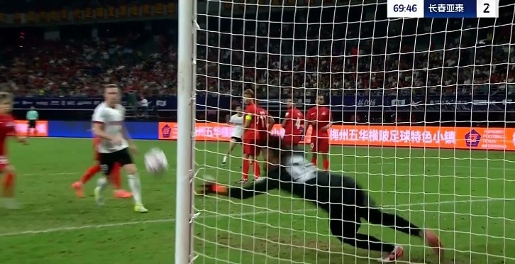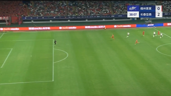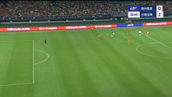 第38分钟,谭龙中场右侧得球,看门将站位靠前,直接一脚超远吊射破门,长春亚泰2-0梅州客家。↓