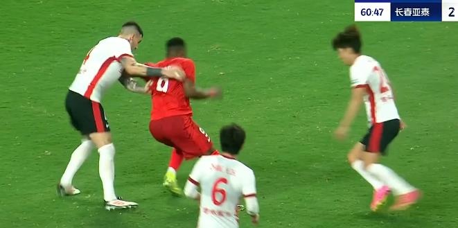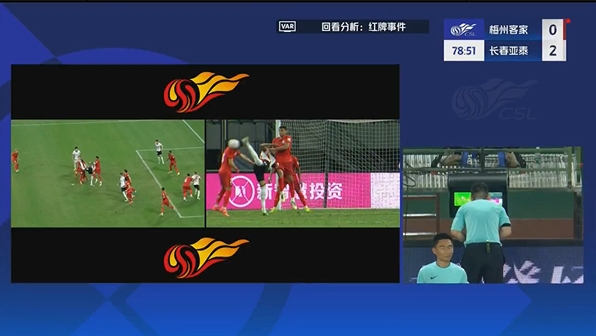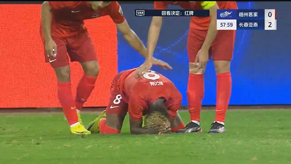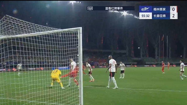 第54分钟,恩戈姆抢点攻门时在吴亚轲抱住皮球后蹬踏到其腹部,主裁判第一时间出示黄牌,但经VAR回放后改判直红将恩戈姆罚下。↓