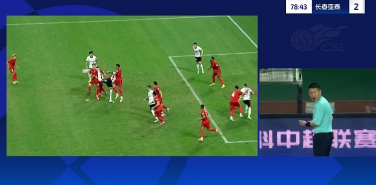 第76分钟,苏祖在禁区内抢点时一个蝎子摆尾险些踢到钟浩然脸部,主裁判出示黄牌,经VAR回放后维持黄牌判罚。↓