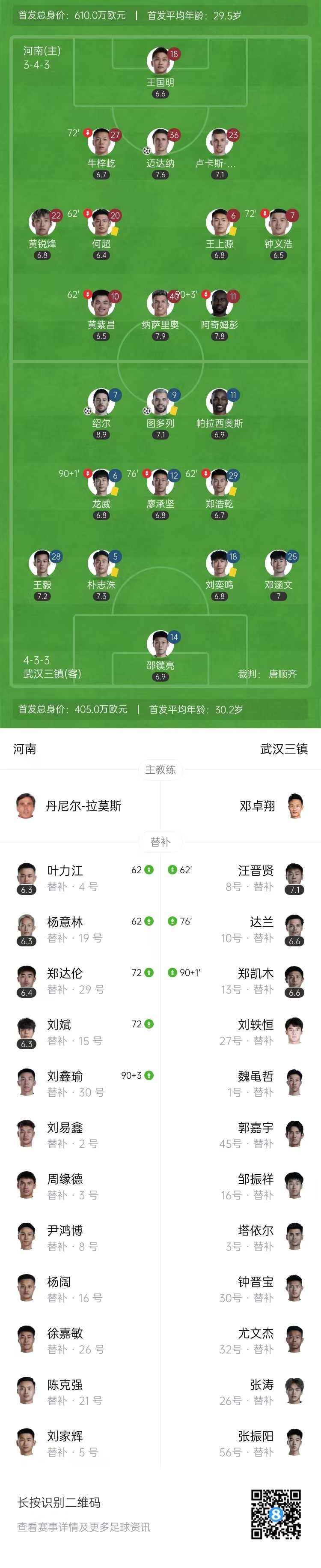 3月21日讯 中超第3轮,河南坐镇主场郑州航海体育场迎战武汉三镇。上半场,绍尔错失良机,方镜淇手指脱位后神扑。易边再战,古斯塔沃头槌破门+失绝杀,绍尔扳平比分。最终河南1-1三镇。积分榜方面,河南2胜1平积1...发表于:03月21日