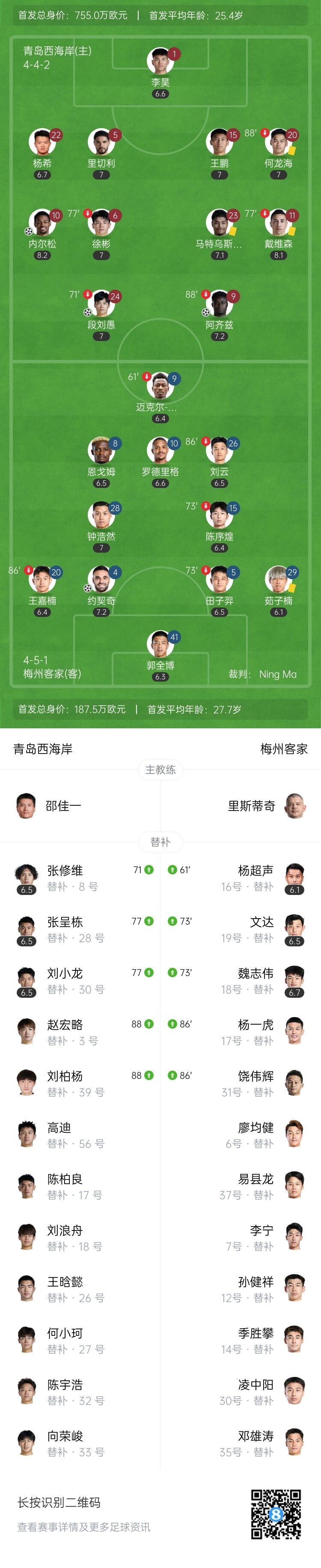 5月2日讯 北京时间5月2日晚上19:00,中超第10轮,青岛西海岸坐镇西海岸大学城体育场迎战梅州客家。上半场,戴维森中圈吊射中楣、阿齐兹补射得手。下半场,段刘愚单刀,内尔松卢斯一条龙破门,约契奇扳回一球。全场结束,青岛西海岸3-1梅州客家。本场过后,青岛西海岸积15分升至第7,梅州客家12分排名第10。