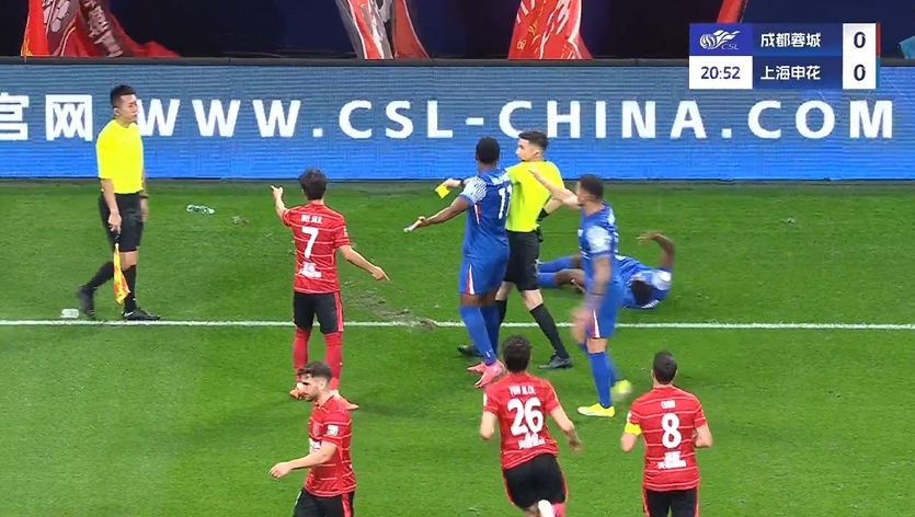 第22分钟,韦世豪滑铲马纳法,主裁判吹罚犯规并向韦世豪出示黄牌警告。↓