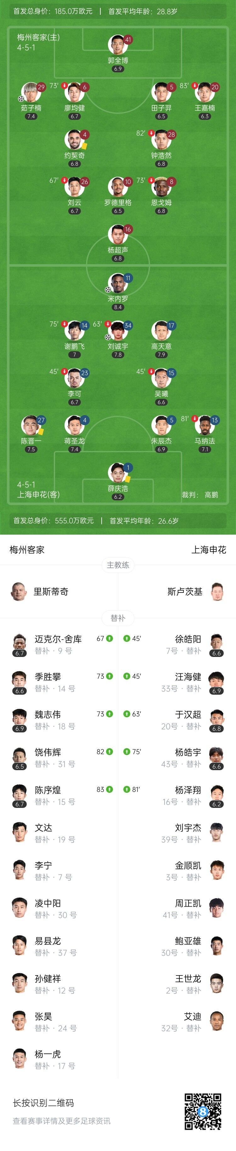 5月6日讯 北京时间5月6日晚上19:00,中超第11轮,梅州客家坐镇五华奥体中心惠堂体育场迎战上海申花。上半场,双方均无建树。下半场,18岁小将刘诚宇斩获申花首球,米内罗破门,茹子楠贴地斩,杨皓宇锁定胜局。全场结束,梅州客家1-3上海申花。