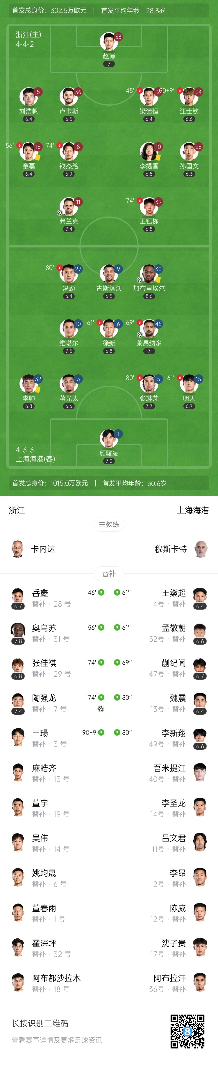 补时15分钟!浙江连扳两球2-2海港 弗兰克补时进球被吹后读秒绝平