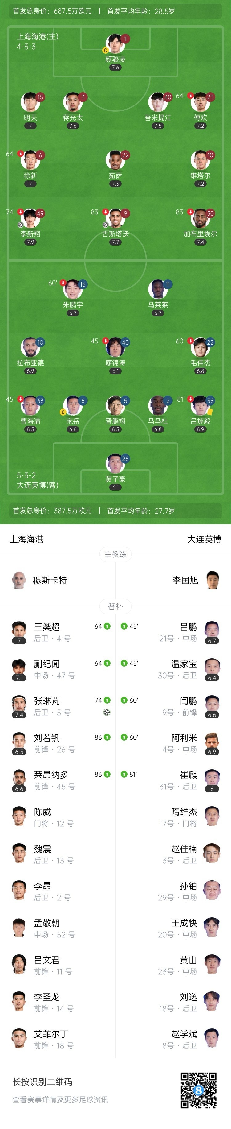 全场比赛结束,上海海港主场3-0完胜大连英博。