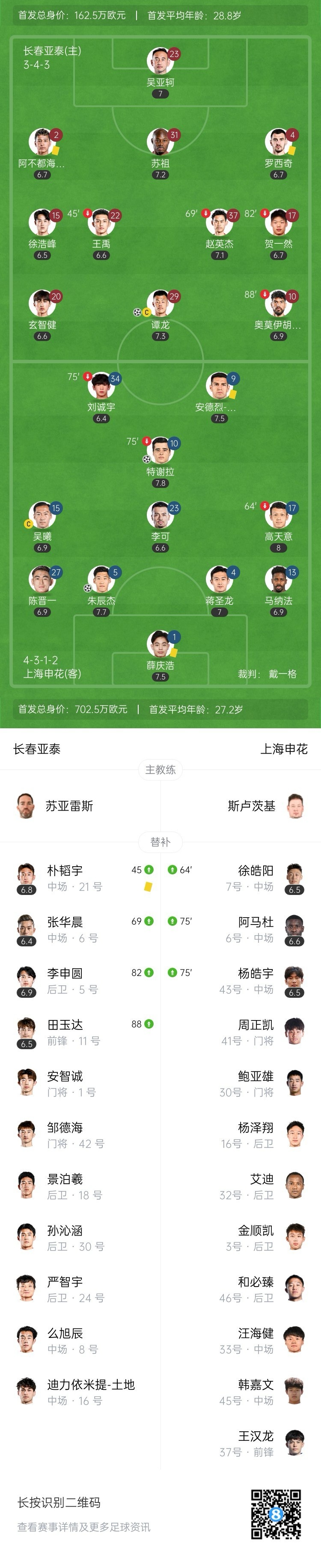 全场比赛结束,上海申花客场2-1战胜长春亚泰。