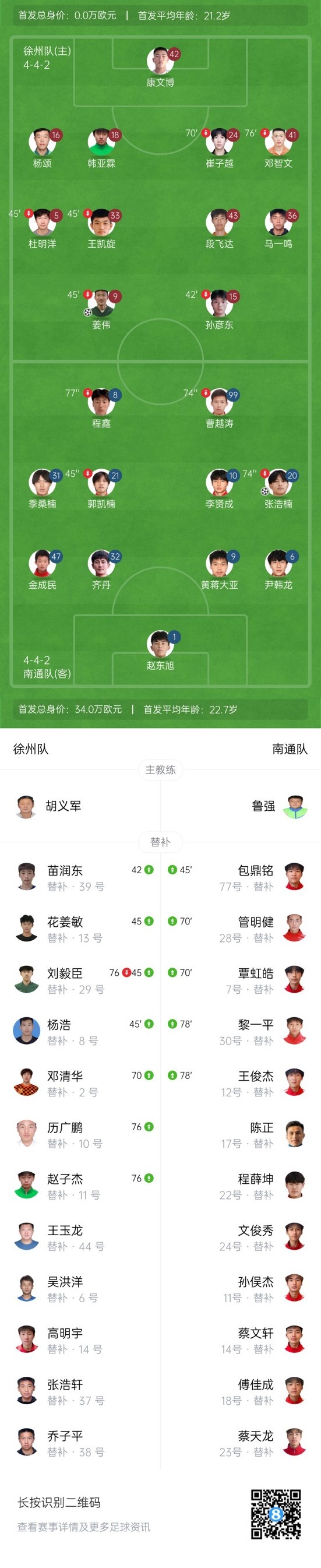 第29分钟,徐州扳平比分!王凯旋右路下底传到门前姜伟头球破门,徐州1-1南通。↓