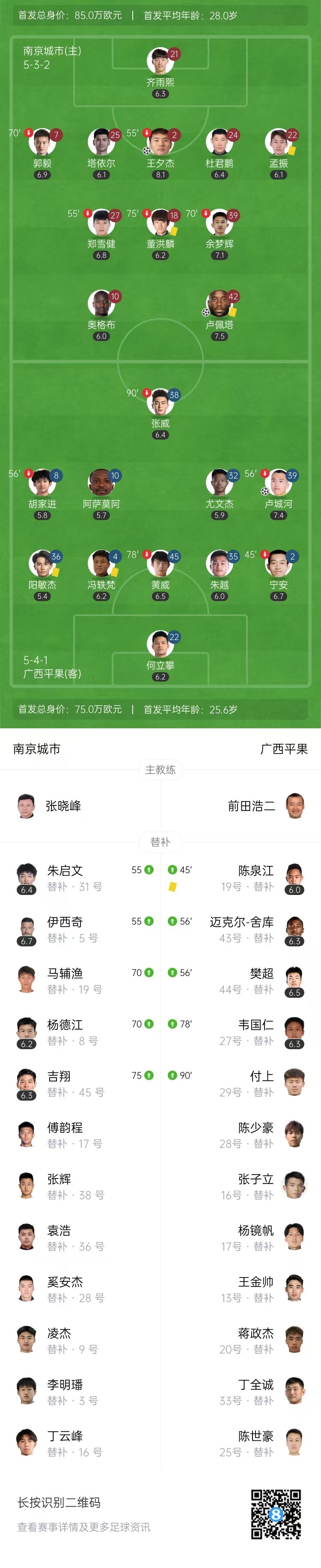 中甲-南京城市2-1逆转广西平果 齐雨熙送礼王夕杰破门卢佩塔制胜