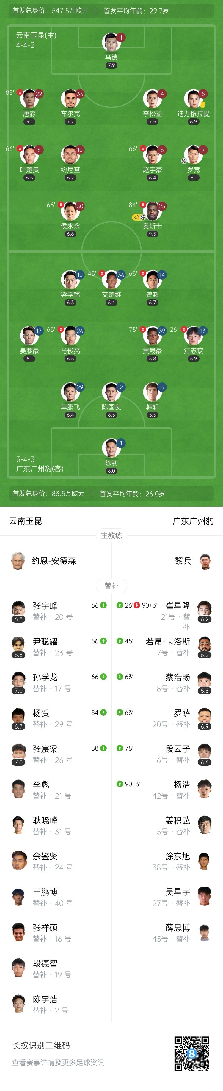 全场比赛结束,云南玉昆3-0击败广东广州豹,晋级足协杯4强。