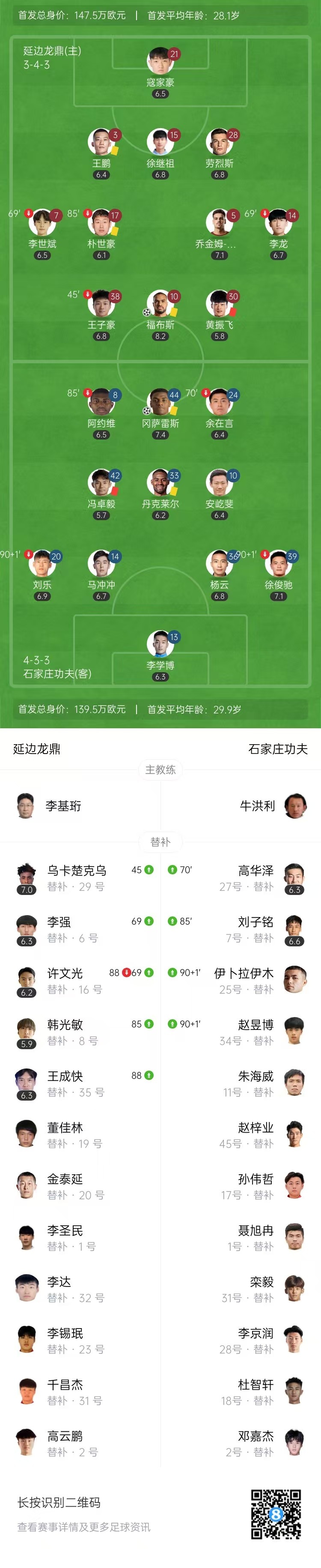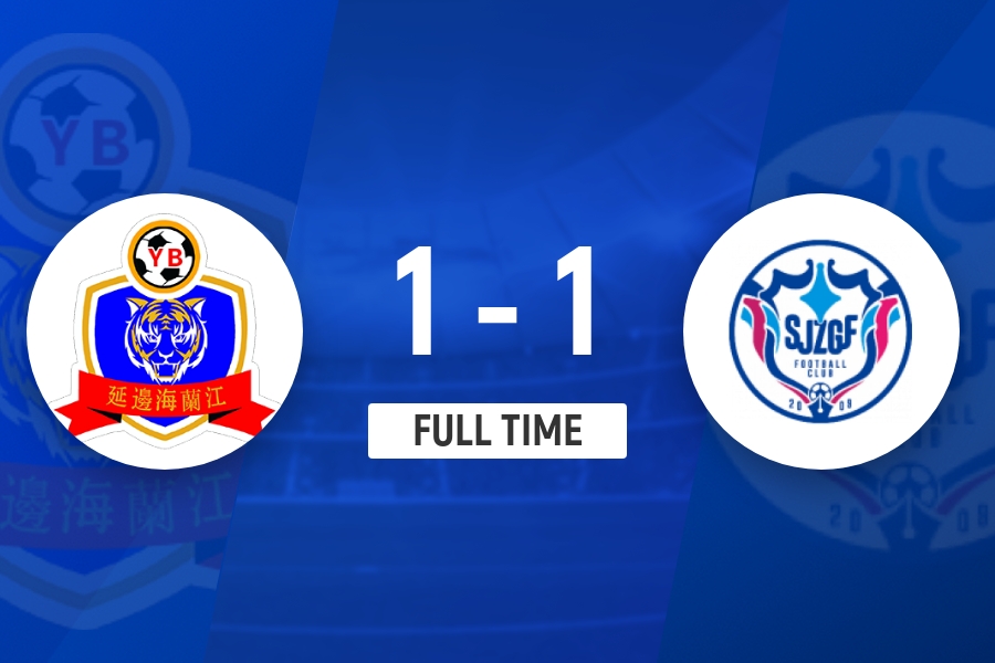 全场比赛结束,延边龙鼎1-1石家庄功夫。