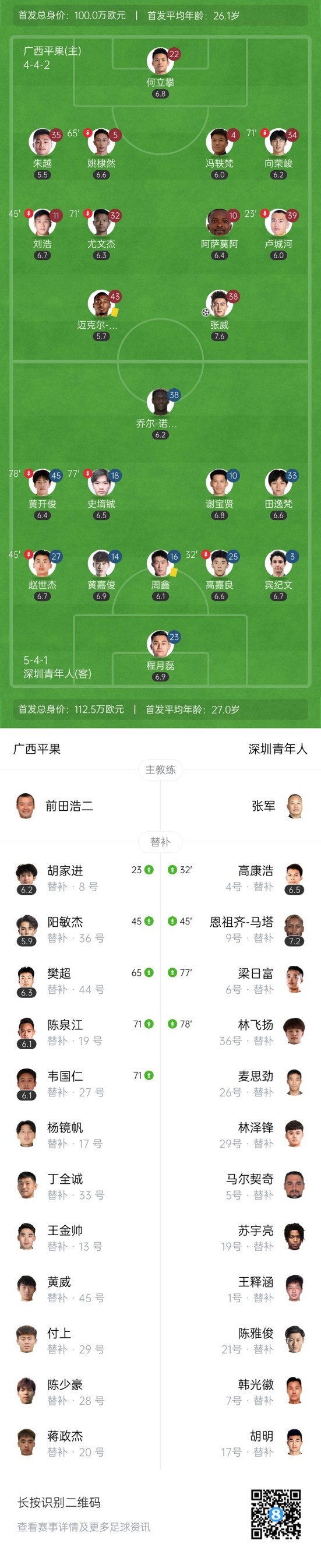 第9分钟,朱越右路下底传到门前张威高高跃起头球破门,广西平果1-0深圳青年人。↓
