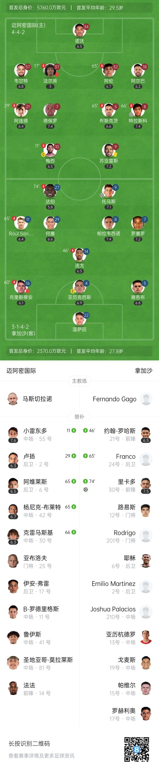 第33分钟,拿加沙扳平比分!桑切斯左路下底横传门前巴达洛尼抽射破门,迈阿密国际1-1拿加沙。↓