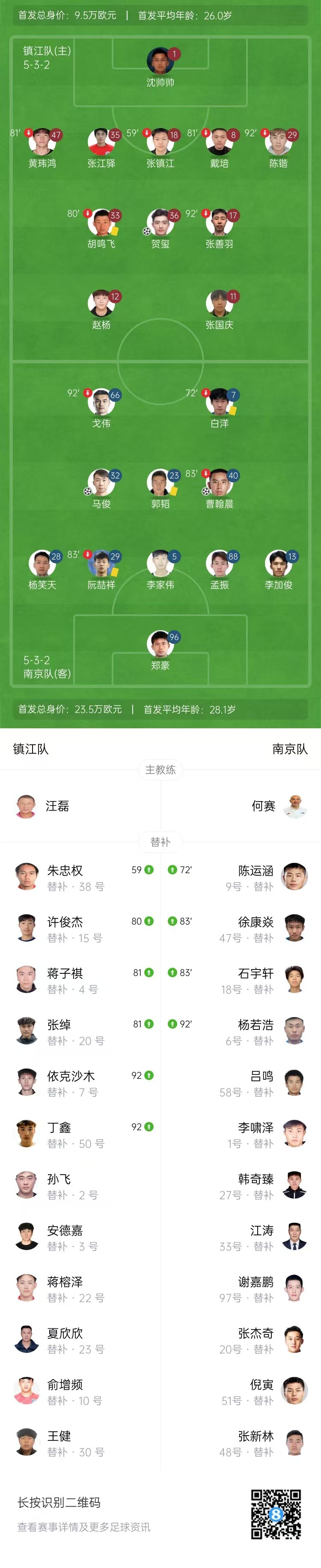 全场比赛结束,镇江1-2南京。