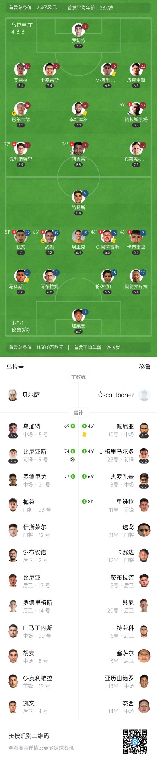 第15分钟,乌拉圭首开记录!瓦雷拉右路下底传到门前阿吉雷头球破门,乌拉圭1-0秘鲁。↓