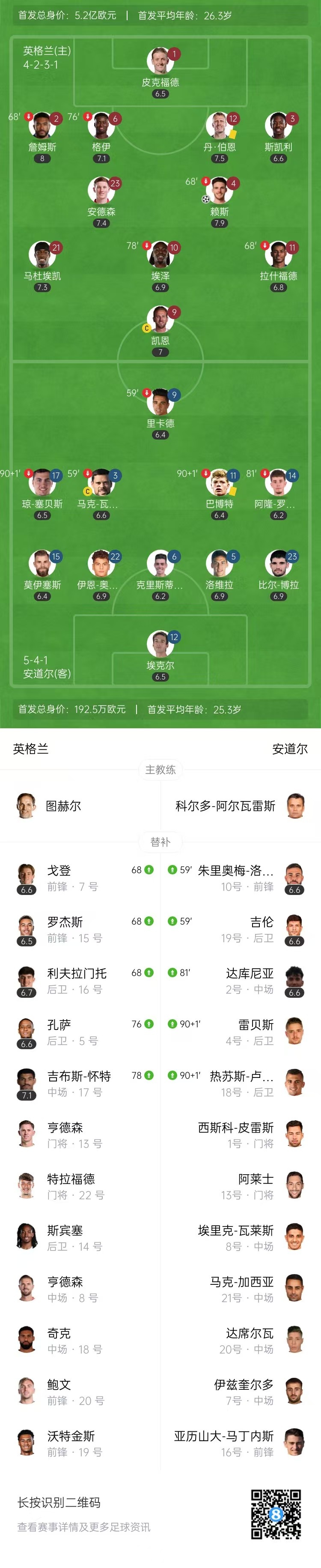 第67分钟,里斯詹姆斯右路送出传中,赖斯后点无人盯防头球扩大比分,英格兰2-0安道尔。↓