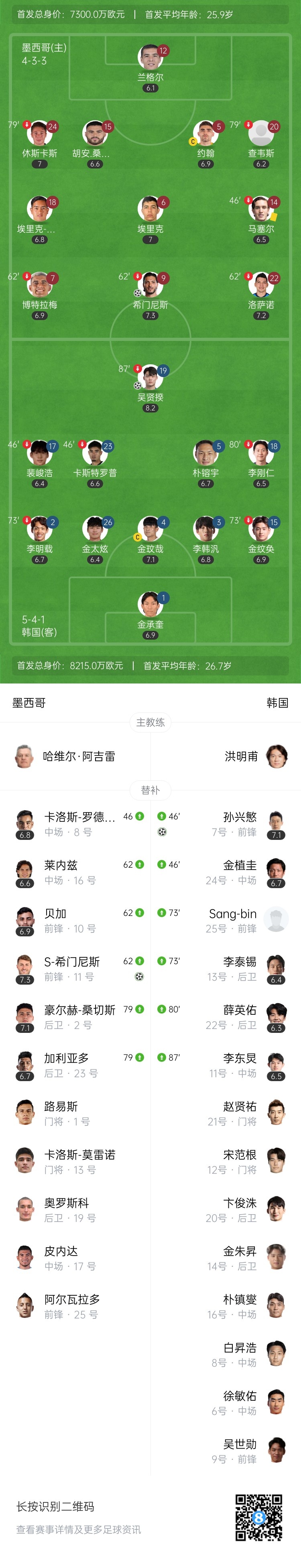 第22分钟,墨西哥禁区前斜传,劳尔-希门尼斯头球破门!墨西哥1-0领先韩国↓