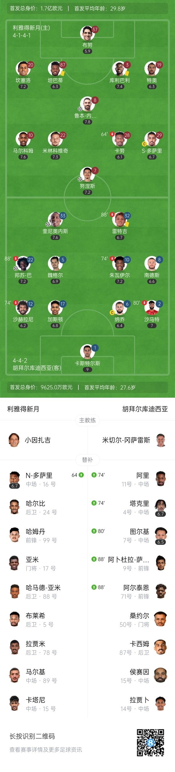 第51分钟,胡拜尔库迪西亚再下一城,右路横传点球点附近奎尼奥内斯推射破门,利雅得新月1-2胡拜尔库迪西亚。↓