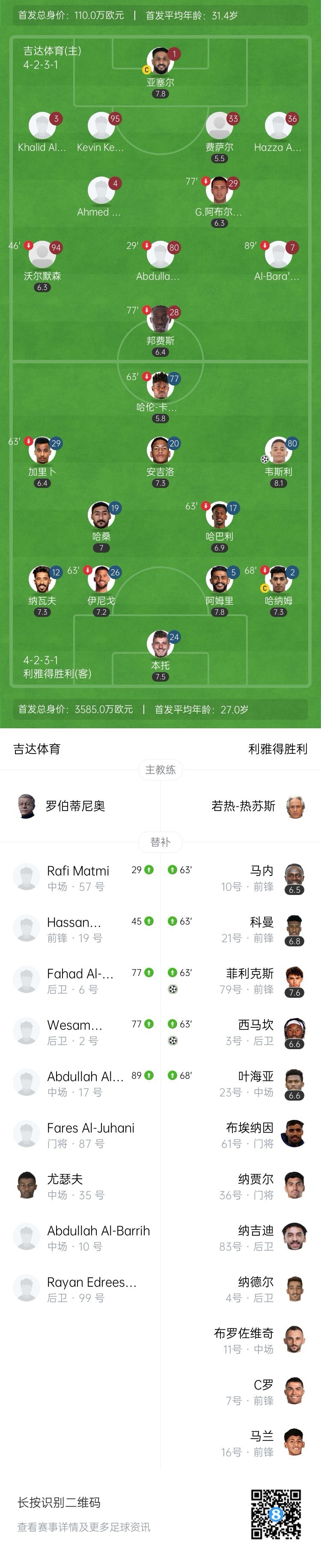全场比赛结束,利雅得胜利客场4-0大胜吉达体育。
