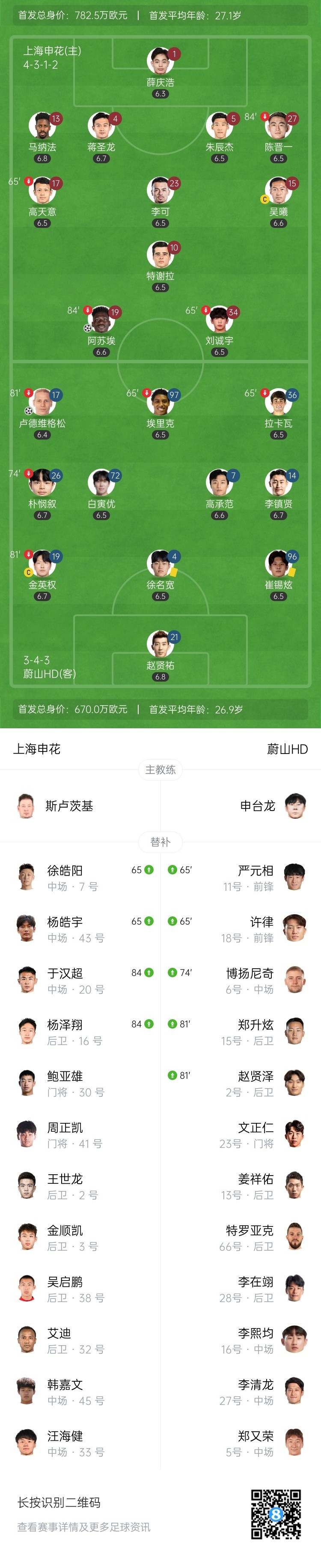 全场比赛结束,上海申花1-1战平蔚山HD。