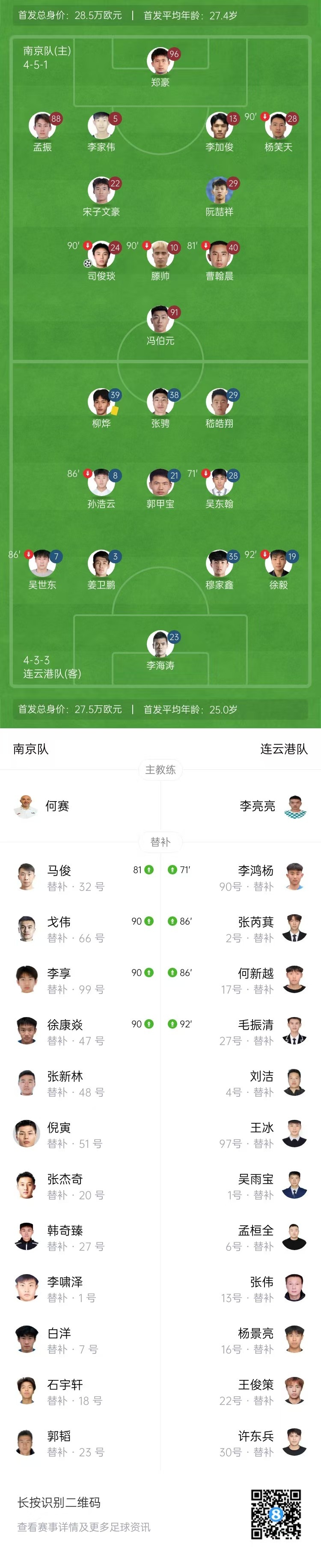 90分钟时间结束,南京1-1连云港。