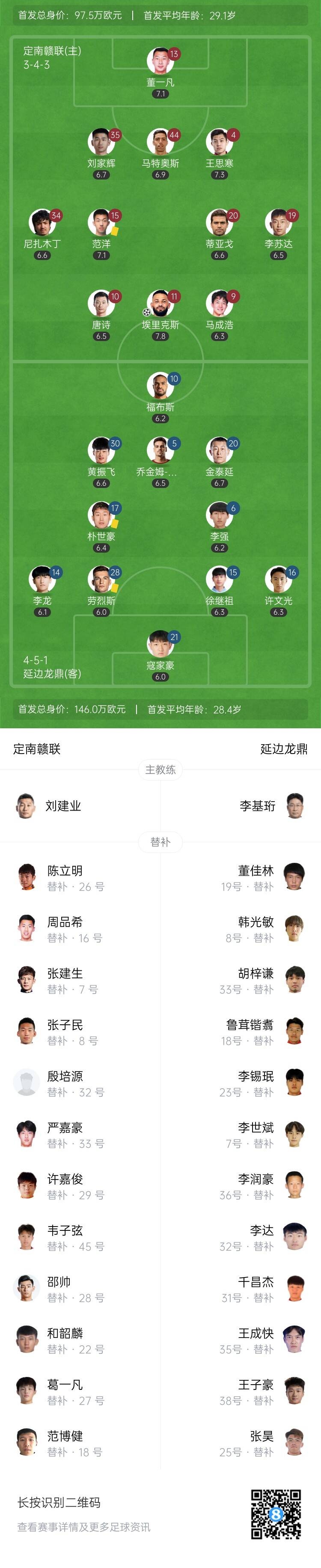 10月4日讯 北京时间10月4日晚上19:30,中甲第25轮,定南赣联坐镇定南青少年足球训练中心迎战延边龙鼎。上半场,埃里克斯破门。下半场,李苏达建功,福布斯扳回一球。全场结束,定南赣联2-1延边龙鼎。本场过后,定南赣联积39分排名第6,延边龙鼎积42分排名第4。