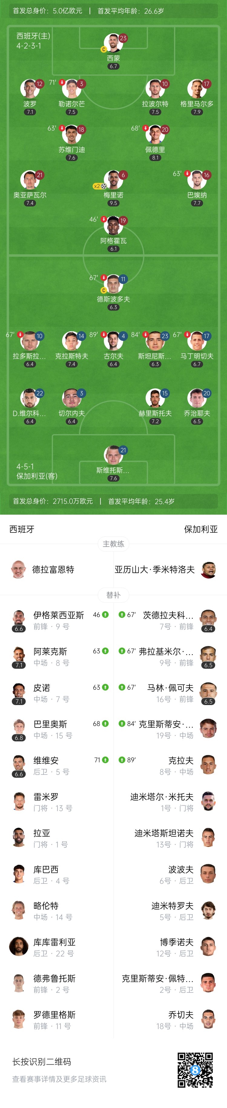 第35分钟,西班牙前场策动进攻,佩德里送出挑传,禁区内勒诺尔芒头球摆渡,梅里诺头球接力破门,西班牙1-0保加利亚。↓