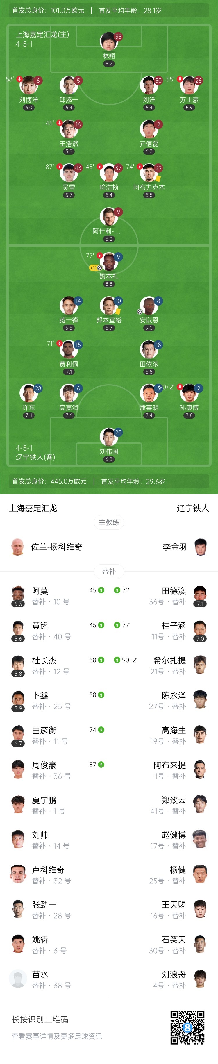 第45+5分钟,邦本宜裕送出直传,姆本扎扛翻后卫单刀进了禁区,第一下射门被林翔挡了一下,随后自己补射空门得手!辽宁铁人2-0领先上海嘉定汇龙↓