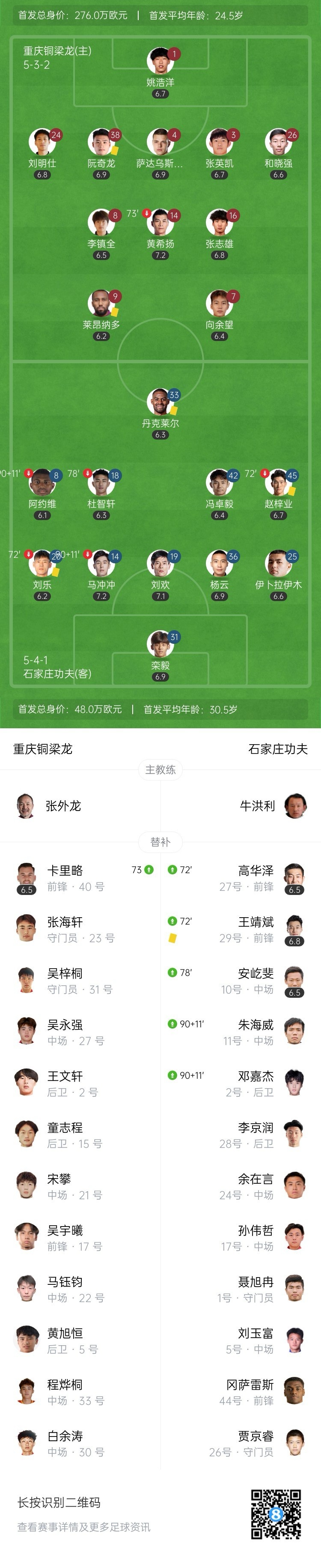 第45+3分钟,铜梁龙任意球快发,向余望抢点头球攻门顶偏。↓