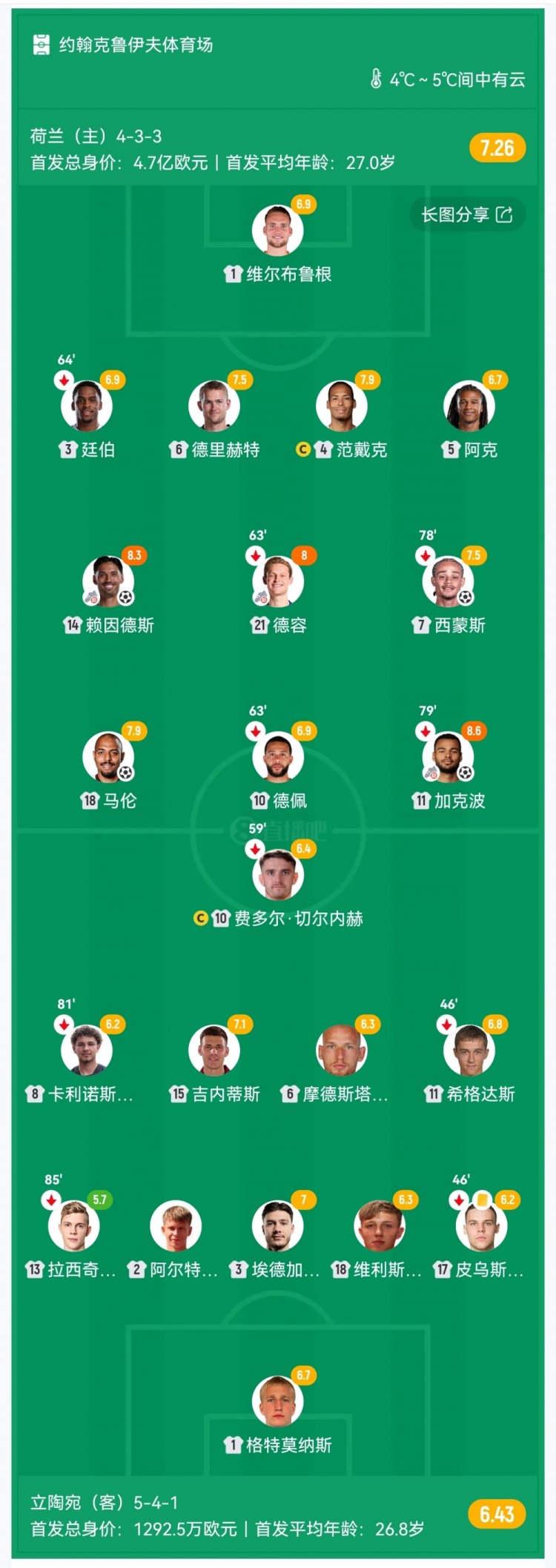 11月18日讯 世预赛欧洲区小组赛G组第6轮,荷兰坐镇主场约翰克鲁伊夫体育场迎战立陶宛。上半场,赖因德斯先拔头筹+中柱。易边再战,德里赫特造点,加克波点射命中,西蒙斯再下一城,马伦一条龙建功。最终荷兰4-0立陶宛。积分榜方面,荷兰20分小组第一,立陶宛3分垫底。