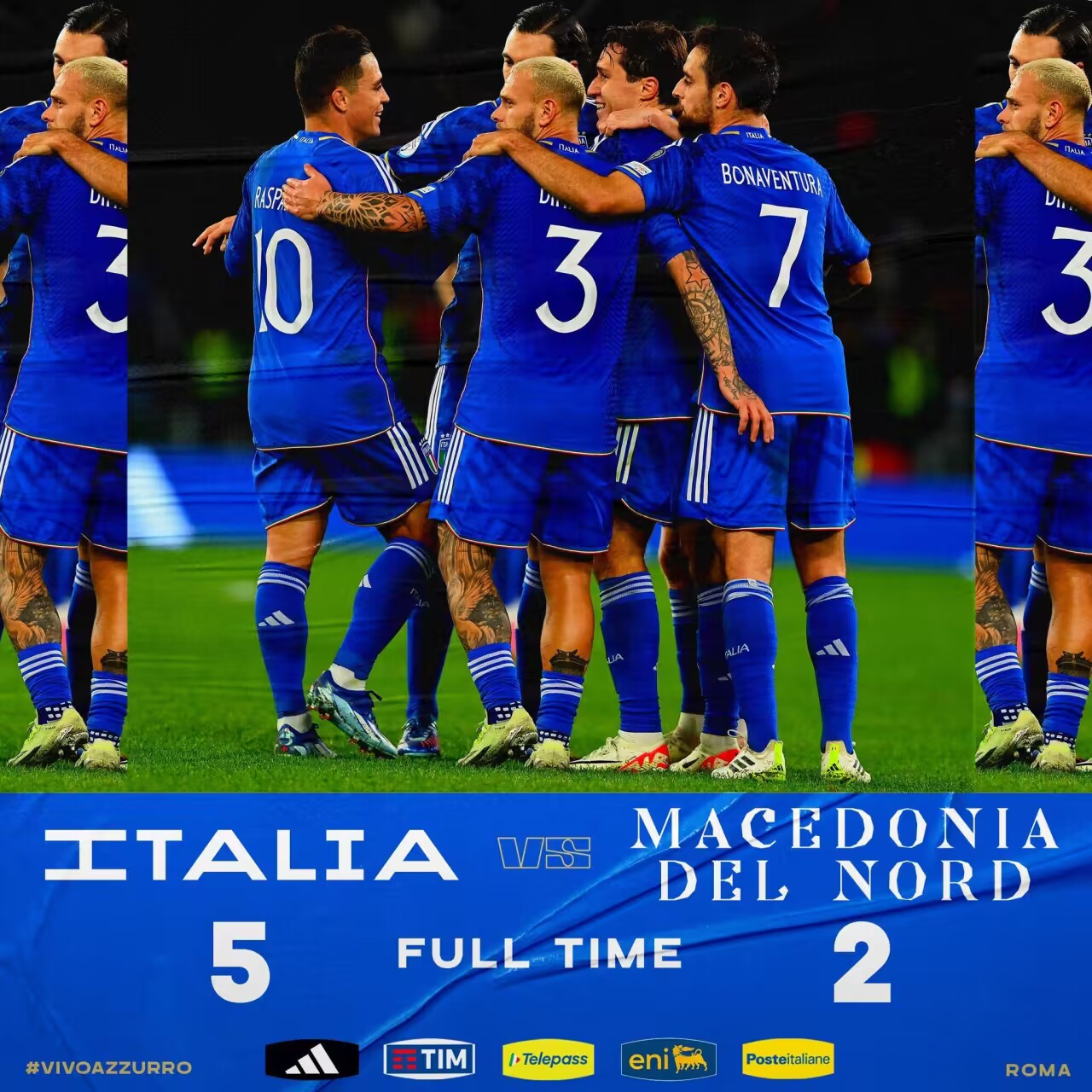 11月18日讯 欧预赛第9轮,意大利主场对阵北马其顿。上半场达米安首开纪录,若日尼奥跳步失点,基耶萨贴地斩+神仙球独中两元;下半场阿塔纳索夫连进两球,拉斯帕多里、沙拉维破门。最终,意大利5-2战胜北马其顿,与乌克兰同积13分.首回合意大利2-1取胜乌克兰,因此末轮打平即可在胜负关系上超越乌克兰,晋级欧洲杯。