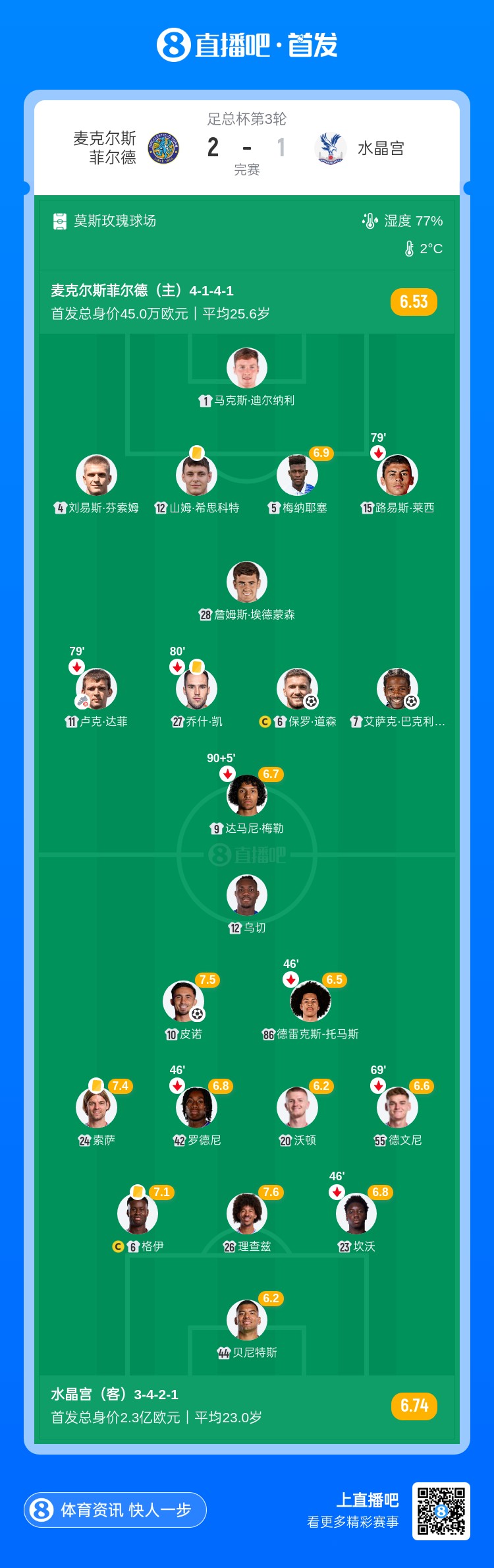 全场比赛结束,麦克尔斯菲尔德2-1淘汰水晶宫!