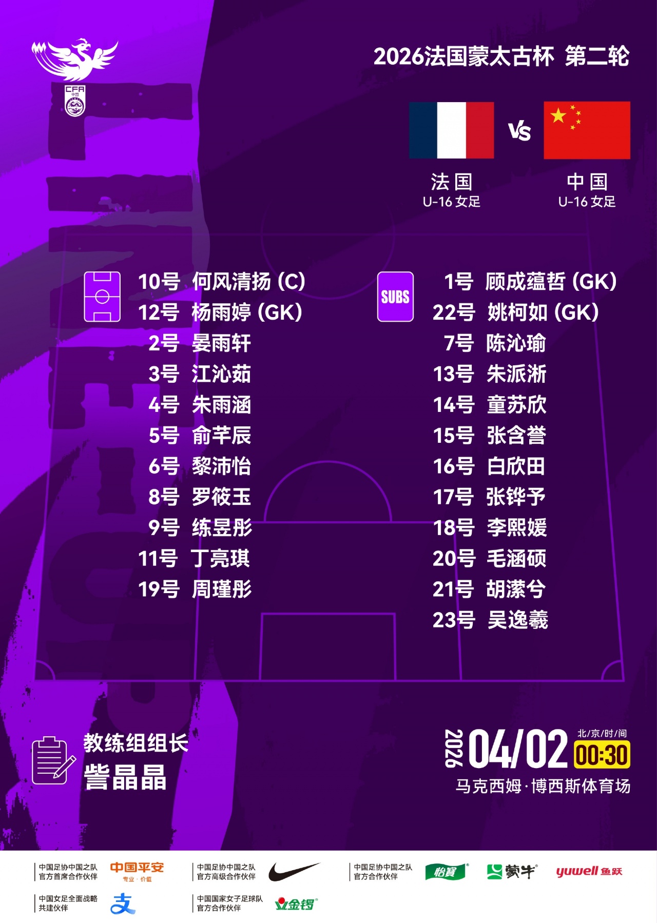 04月02日讯 北京时间4月2日00:30,蒙太古女杯小组赛A组第2轮,中国女足U16在法国马克西姆·博西斯体育场对阵法国女足U16。上半场,周瑾彤凭借任意球直接破门为中国队取得领先;下半场开场,何风清扬禁区内停球转身低射扩大比分,随后法国队依靠点球扳回一城。最终,中国女足U16 2-1击败法国女足U16。小组赛第三轮,中国女足U16将在北京时间4月4日00:30对阵墨西哥女足U16,法国女足U16则将对阵英格兰女足U16。