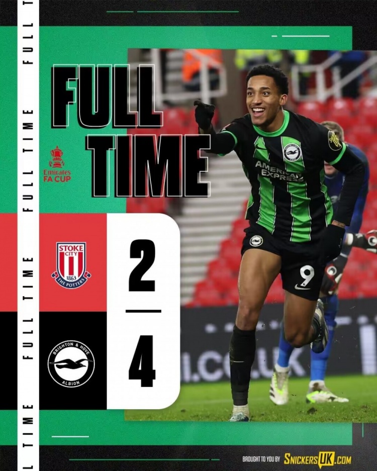 全场比赛结束,布莱顿4-2斯托克城。
