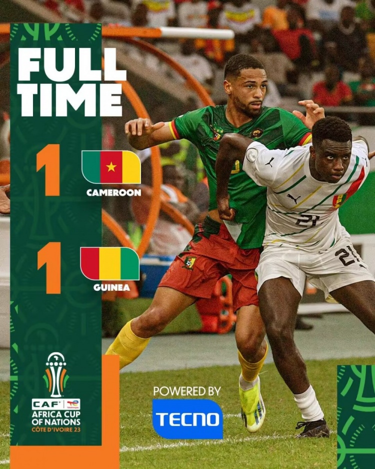 1月16日讯 北京时间1月16日1点,非洲杯小组赛C组首轮喀麦隆对阵几内亚。上半场,巴约推射破门,卡马诺补时恶意踩踏染红。下半场,马格里头球扳平比分。全场比赛结束,喀麦隆1-1几内亚。