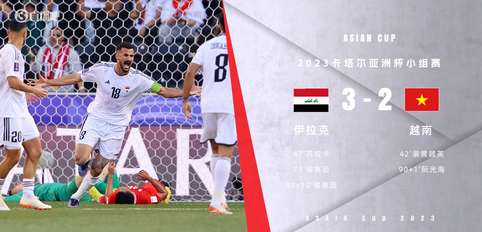 1月24日讯 北京时间1月24日19:30,亚洲杯D组第3轮,伊拉克vs越南。上半场,越南队利用伊拉克乌龙打入一球,但因本方球员在越位位置参与进攻被吹无效,裴黄越英破门,胡文康染红;下半场,苏拉卡头球破门扳平比分,埃曼-侯赛因反超比分后失点,阮光海扳平,埃曼-侯赛因点球绝杀。最终,伊拉克3-2越南,小组赛3战全胜头名出线,越南3战皆败垫底出局。