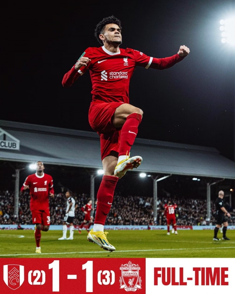 1月25日讯 北京时间1月25日凌晨4:00,英格兰联赛杯半决赛次回合,利物浦客战富勒姆。上半场宽萨助攻路易斯-迪亚斯破门,随后迪亚斯再进一球,但因为努涅斯越位在先被吹,上半场利物浦暂1-0富勒姆;下半场威尔逊助攻迪奥普破门,最终利物浦1-1富勒姆,总比分3-2淘汰对手,决赛将对阵切尔西,比赛时间为2月26日凌晨0:30。