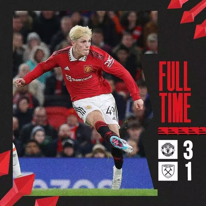 全场比赛结束,曼联3-1西汉姆联。