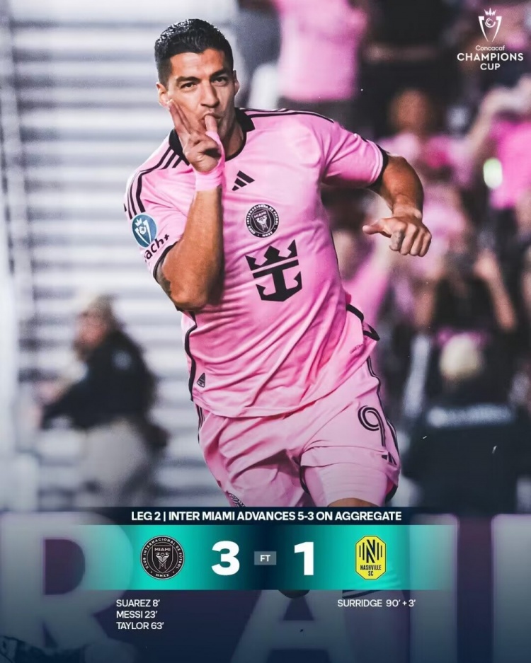 美冠杯-梅西&苏牙传射建功 迈阿密国际3-1纳什维尔总比分5-3晋级