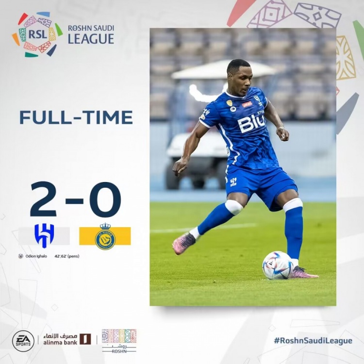 4月19日讯北京时间4月19日凌晨3:00,沙特联赛第25轮,利雅得新月对阵利雅得胜利。上半场,伊哈洛造点并亲自主罚命中为利雅得新月取得领先;下半场,C罗锁喉动作吃到黄牌,马沙里波夫送点伊哈洛主罚再入一球完成梅开二度,C罗打入一球,可惜越位在先!全场比赛结束,利雅得新月2-0利雅得胜利!