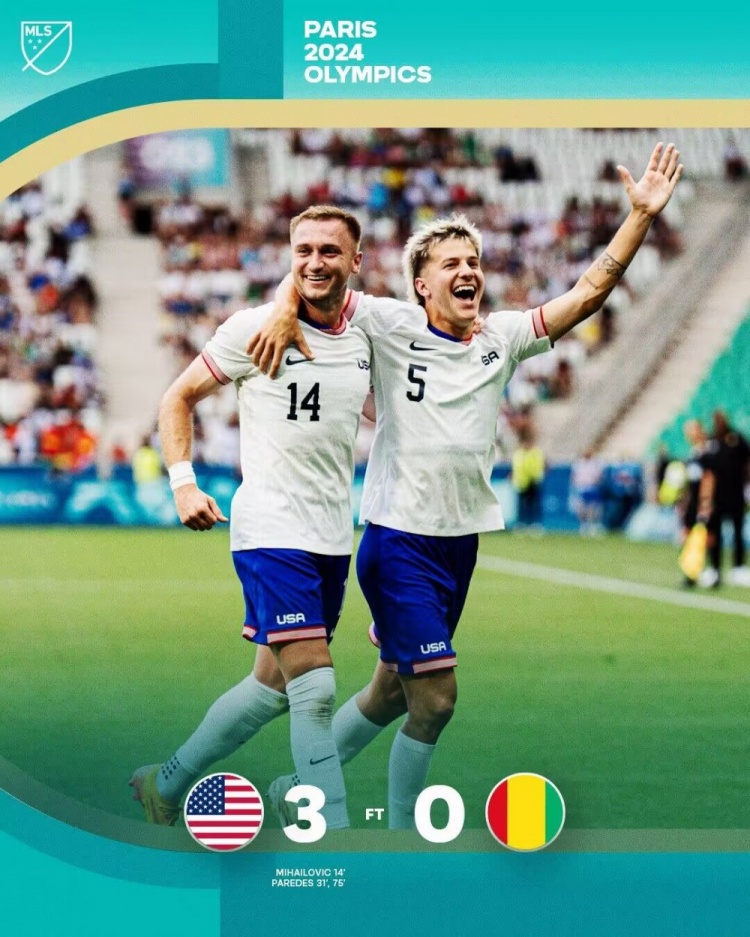 奥运男足-美国3-0大胜几内亚晋级将战摩洛哥,K-帕雷德斯双响