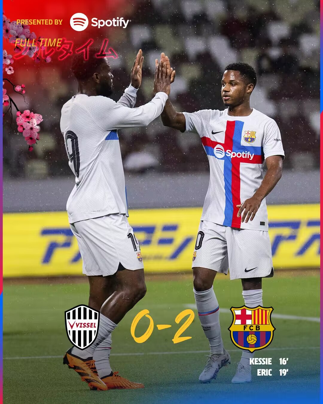 第19分钟,托雷主罚角球开出,埃里克-加西亚高高跃起头球弹地入网,神户胜利船0-2巴塞罗那!↓