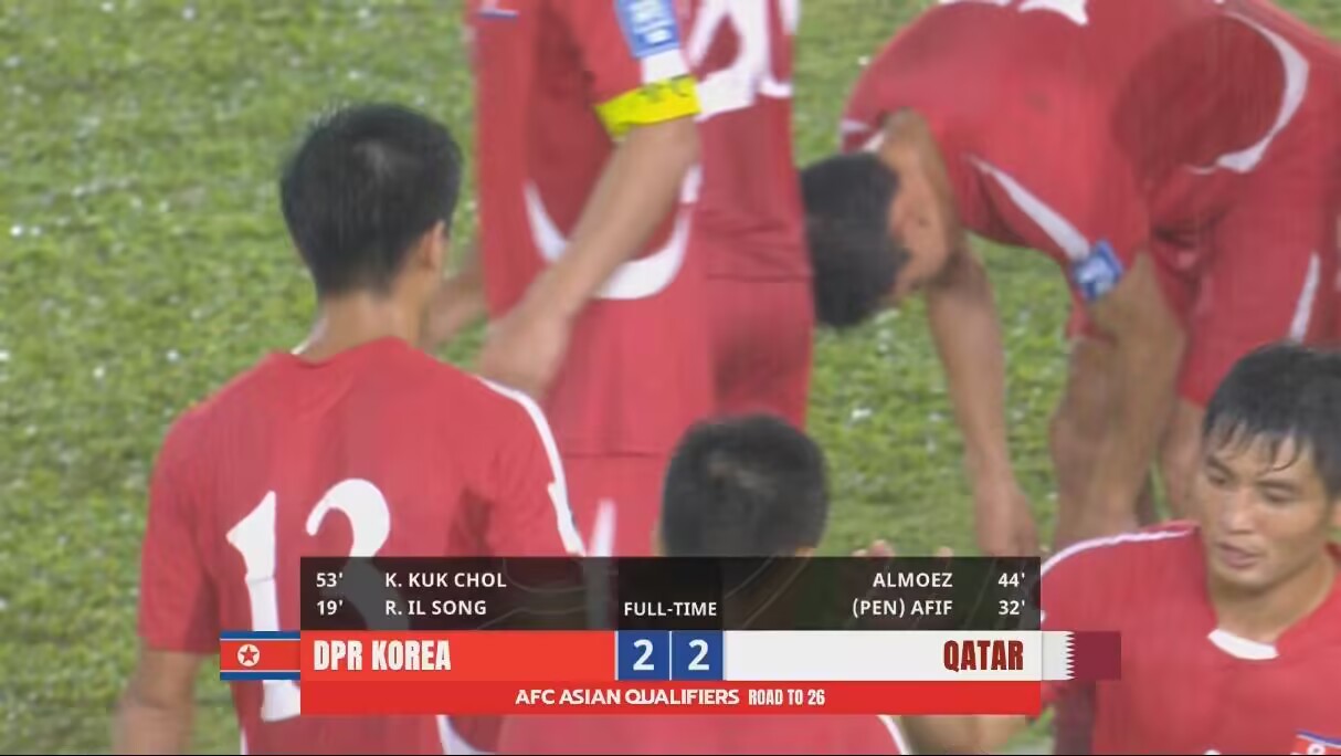 顽强!10人朝鲜世预赛2-2逼平卡塔尔,朝鲜少打1人长达70分钟