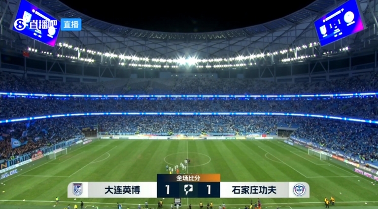 下半场补时4分钟。最终全场比赛结束,大连英博1-1石家庄功夫。