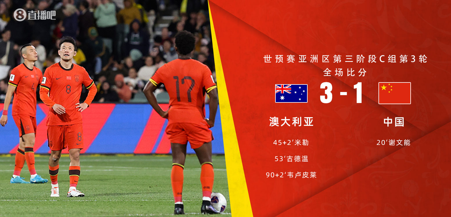 三连败!国足1-3澳大利亚连场遭逆转 谢文能首球难救主古德温传射