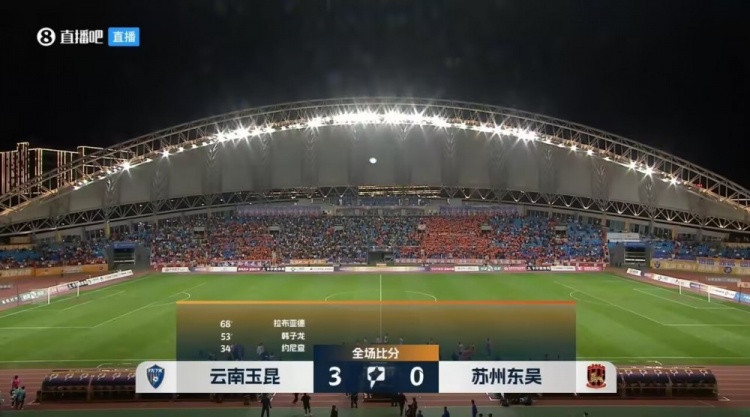 下半场伤停补时5分钟,全场比赛结束,云南玉昆3-0苏州东吴。