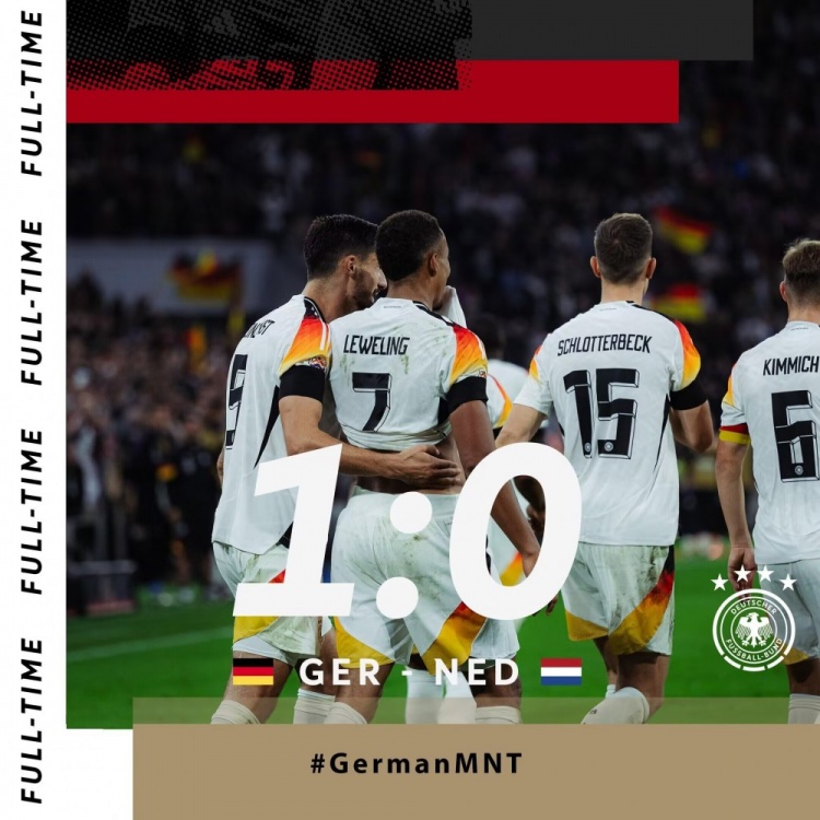 10月15日讯 北京时间2:45,欧国联A联赛第4轮,德国主场对阵荷兰。上半场,勒威林闪击破门,但因越位被吹。下半场,勒威林爆射破门,国家队首秀斩获处子球!随后哈维-西蒙斯远射击中横梁。最终,德国队1-0战胜荷兰。