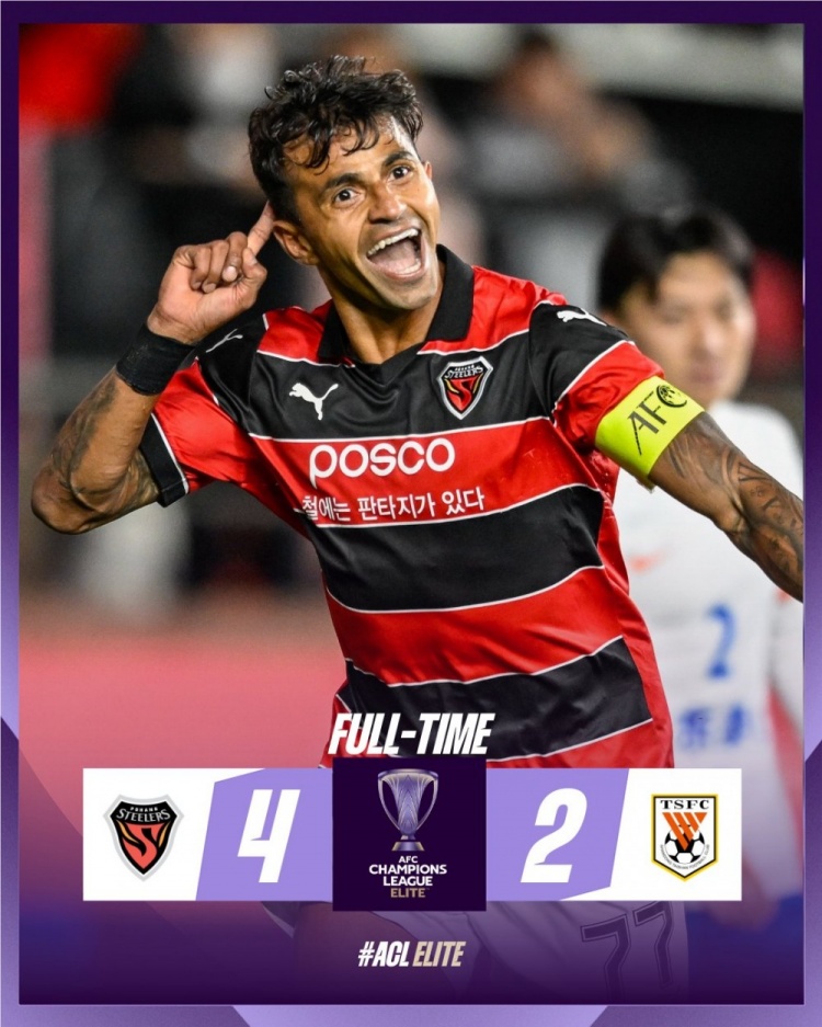 全场比赛结束,山东泰山2-4浦项制铁。